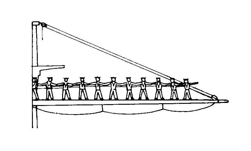 «Не нужно кричать сверху и такого допускать не следует» – пишет Люс. Когда штык-болт проведен, матрос на рее поднимает руку, а другие матросы действуют по этому сигналу.