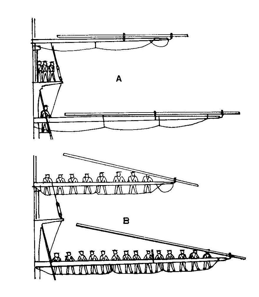 Предназначение портовых учений заключалось в увеличении эффективности аналогичных маневров, выполняемых в море. Однако, как мы увидим, эти тренировки проводились для ускорения процесса в ходе непредвиденных работ на море, таких как, например, замена двухсоставных марса-шкотов и гитовых на односоставные, чтобы быстро упростить управление парусом. С легкими реями и брам-стеньгами военного корабля работали по тем же принципам, что и на торговых кораблях того времени, но они были оснащены множеством мелких усовершенствований, неизвестных на торговом флоте, при помощи которых их можно было поднимать и опускать с легкостью и быстротой.