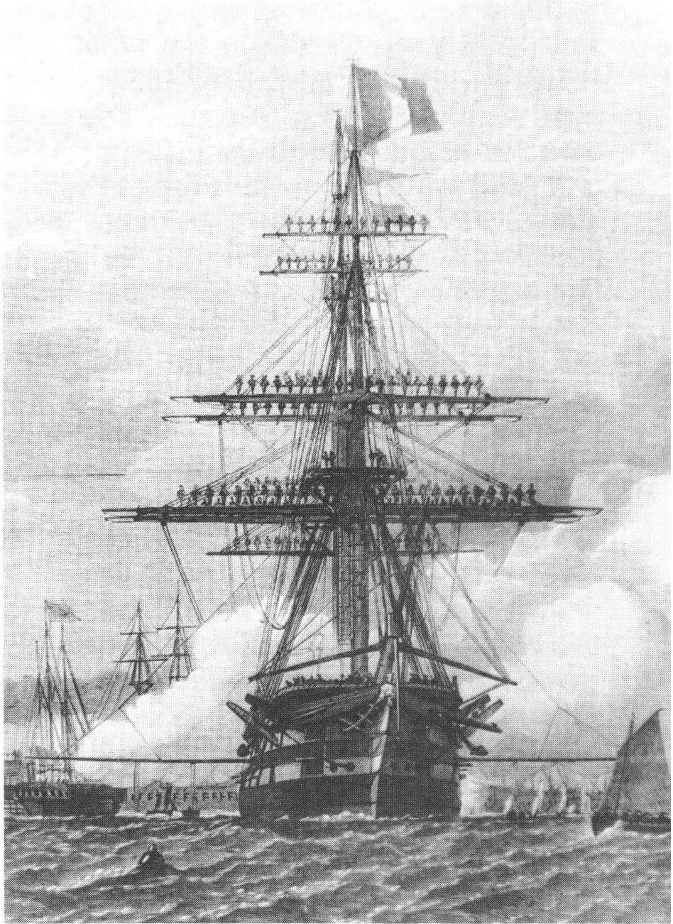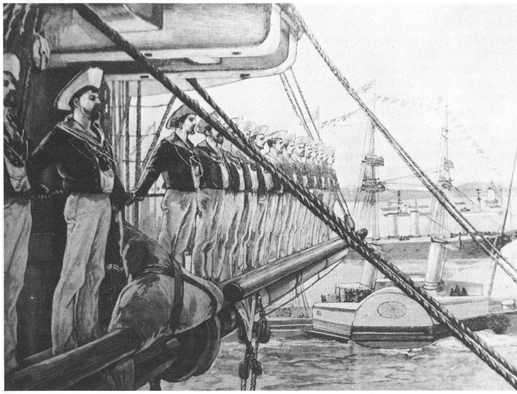 Британский корабль «Edgar», салютующий реями с экипажем на Международном военно-морском фестивале в Портсмуте в 1865 году. Гравюра Лайонела П. Смита в Illustrated London News, 1887 г. (Коллекция Марка Майерса).