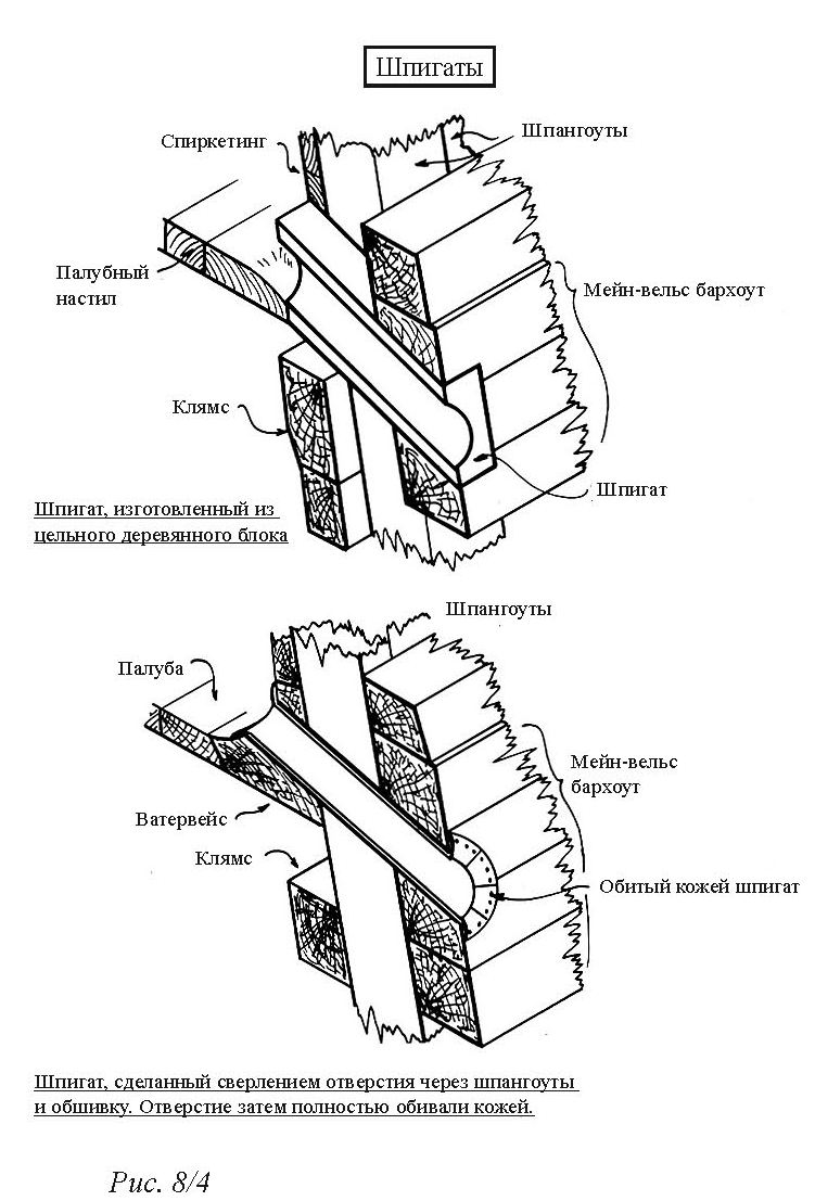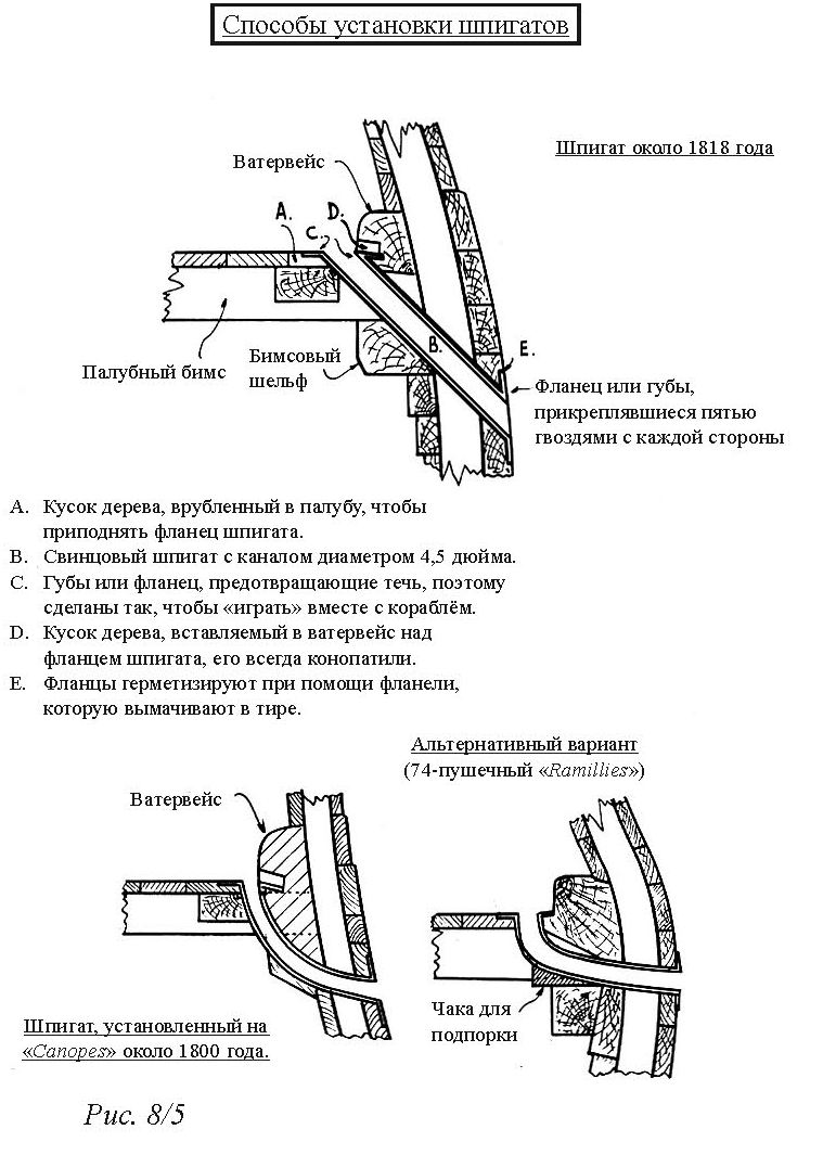 В конце 17 века и вначале 18 века использовалось два варианта шпигатов. В первом через корабельный борт проводили простую свинцовую трубу, которую тщательно конопатили для герметичности. Во втором шпигат делали в форме подходящего по размеру «вставного» деревянного блока, обычно вязового, в котором сверлили требуемое отверстие и обивали его кожей. В любом случае внешний конец шпигата оснащали кожаным клапаном или «носком», чтобы помешать попаданию воды. Обычно предпочитали использовать шпигат из свинцовой трубы, чем деревянный блочный тип (рис. 8/4 и 8/5). Приведённые далее данные взяты из «Shipbuilder's Repository» 1789 года издания.