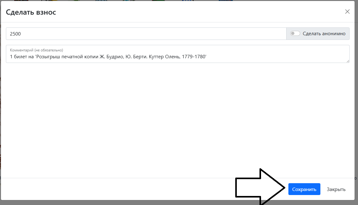 При желании вы можете приобрести дополнительные билеты, нажав на кнопку "Приобрести билет". Робот автоматически поставит требуемую сумму и описание, которое позволит идентифицировать ваши средства (не забывайте нажимать "Сохранить"). Все собранные средства попадают в общий котёл клуба и тратятся на текущие проекты, о чём можно убедиться в меню "Обещанные платежи", где данный взнос будет отражаться следующим образом. Там же дублируются реквизиты для перечисления средств.