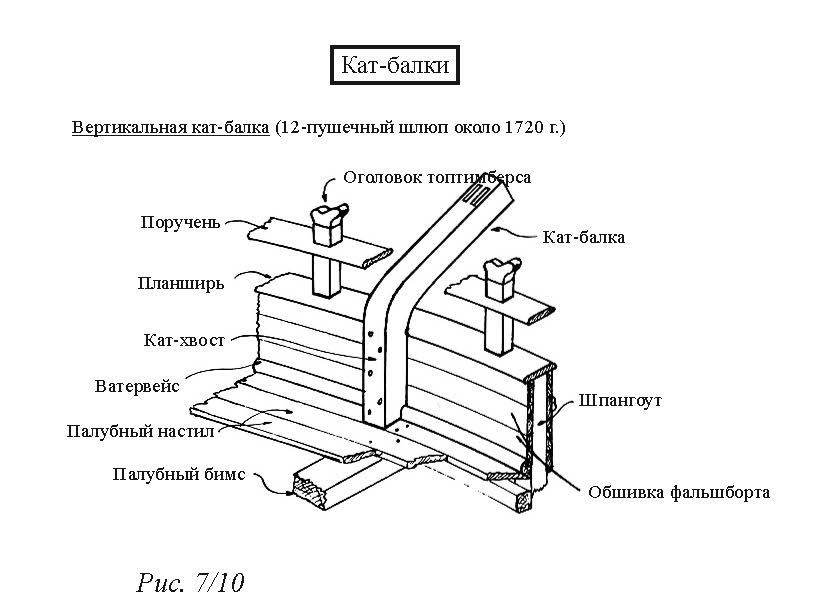 Прямая кат-балка. Такая в основном использовалась на малых судах, таких как яхты, шхуны, бомбовые кечи и некоторые бриги. На большинстве этих судов были короткие баки с очень низким или вообще отсутствующим фальшбортом. Если смотреть сверху, то кат-балки кажутся параллельными на протяжении всей длины, но если смотреть сбоку, то нижняя сторона кат-хвоста сужается к пятке. Сам кат-хвост не интегрировался в корабельный набор, как в других вариантах. Он располагался на баковом настиле и крепился болтами через палубные бимсы, причём болты расклёпывали снизу (рис. 7/12).