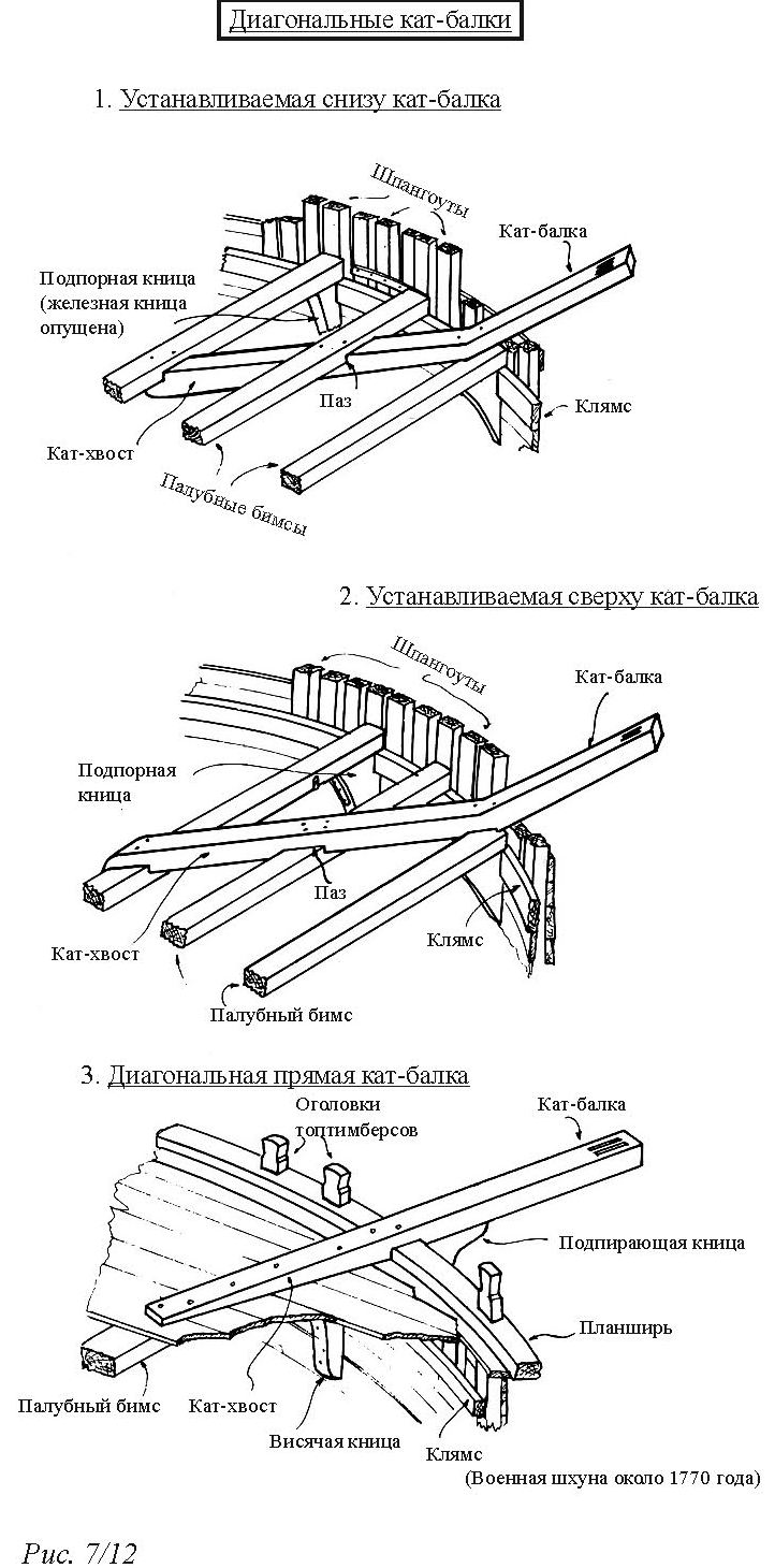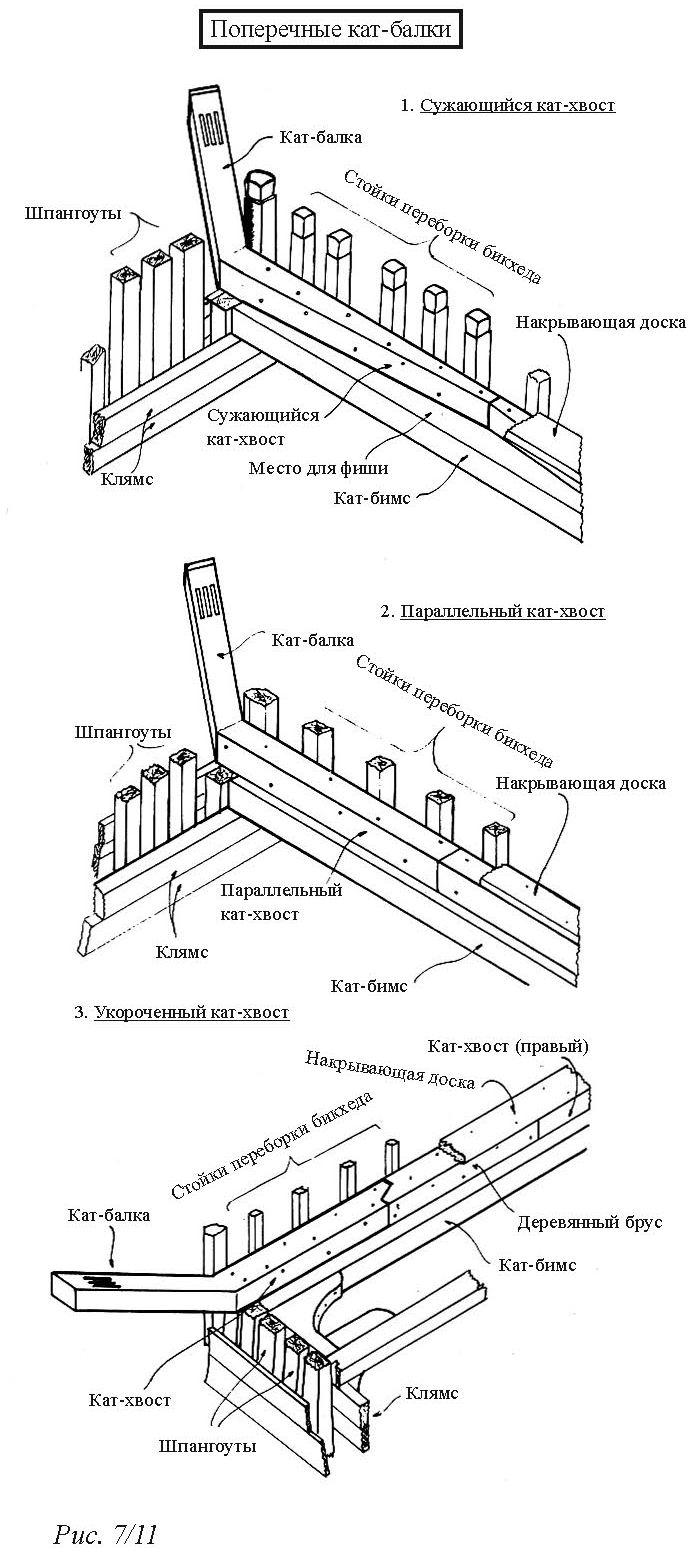 Длина кат-хвоста примерно равнялась длине кат-балки, выступающей за корпус. В некоторых случаях хвост был чуточку длиннее, что зависело от относительного положения баковых бимсов. Там, где кат-хвост проходил под бимсами, на его верхней стороне вырубали паз на глубину 1,5-3 дюйма. Таким образом кат-хвост нарубали на нижнюю сторону бимсов. Через каждый бимс забивали два болта и плотно их расклёпывали. Сама кат-балка проходила прямо через корабельный борт или поднималась через палубный настил (рис. 7/12(1)).