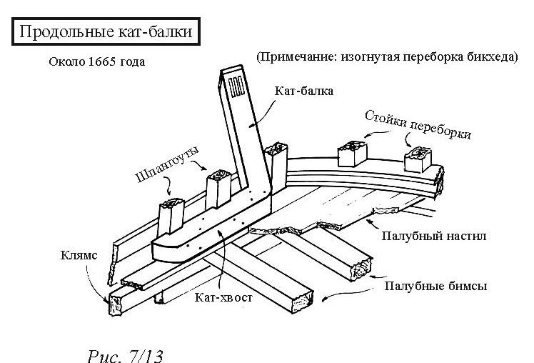 Этот вариант крепления кат-балки к корабельному набору встречается редко и применяется в основном на нескольких судах, построенных до 1685 года. Кат-хвост в этом случае ставили продольно в сторону кормы. Внешнюю сторону крепили болтами к корабельным шпангоутам. Длина кат-хвоста равнялась 1-1,5 длины той части кат-балки, что выступала за корпус (рис. 7/13).
