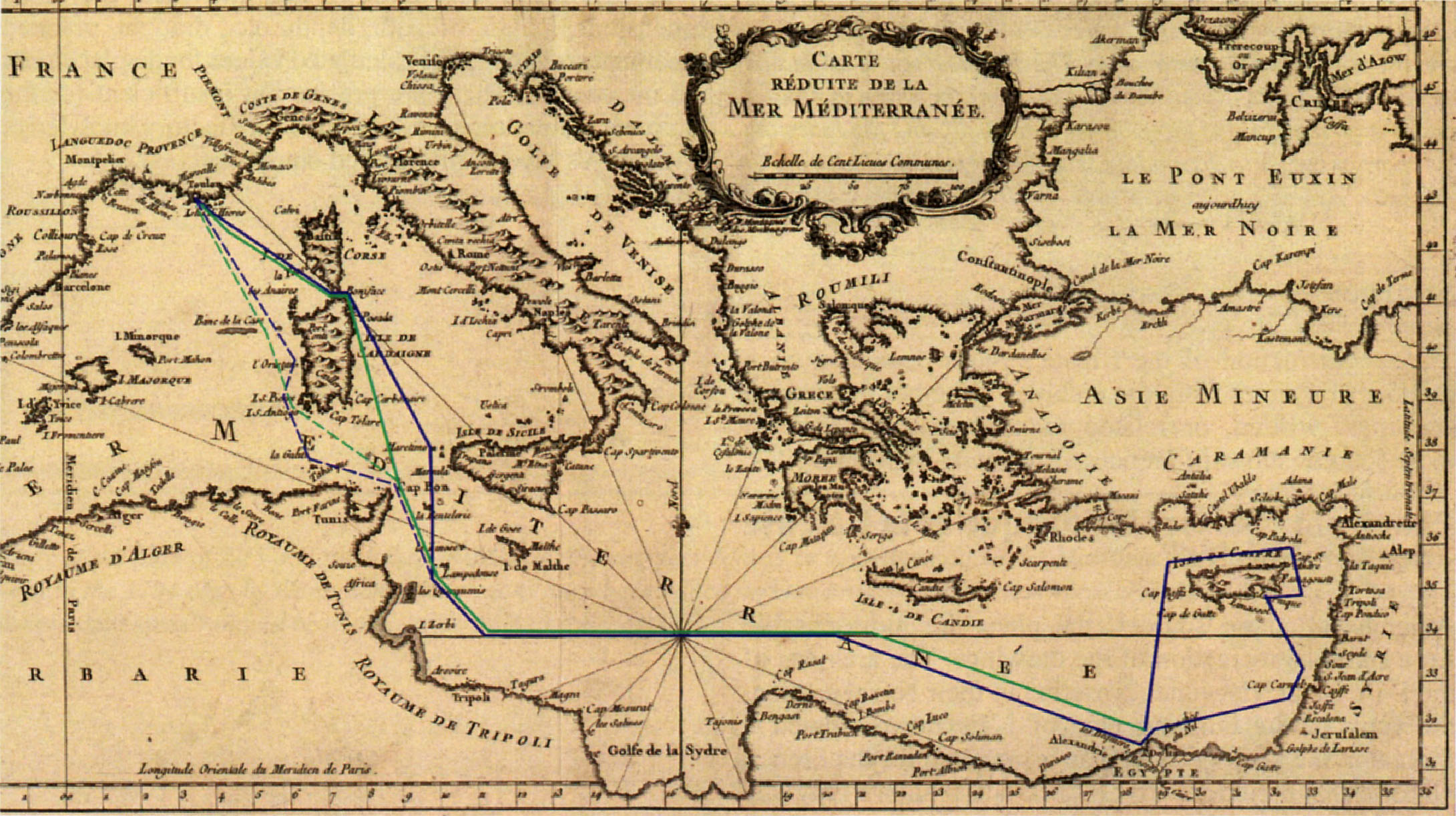 Если ему не удастся пересечь пролив Бонифачо, он будет держаться ближе к Сардинии до параллели Лористана. Затем он отойдёт от суши и направится на юго-запад, сделав поправку, чтобы пройти в 20-25 лье от островов Сен-Пьер. Прибыв на параллель этих островов, он направится на юго-запад, сделав поправку, чтобы пройти мимо острова Гарита. Он продолжит путь вдоль Варварского побережья, ночью обогнёт мыс Бон и пройдёт между Каркани и островом Лампедуза.