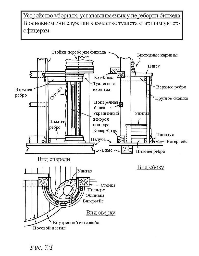 Конструкция круглой уборной была довольно лёгкой, учитывая открытое место на корабельном гальюне. На корабля 1 и 2 рангов внутренний диаметр составлял примерно 1/10 длины переборки, а на остальных кораблях – 1/12. Основание было сделано из брусьев квадратного сечения около 4 дюймов, отделанных с требуемым изгибом. Верхушка была точно такой же. Пространство между ними зашивали вертикальными 1,5-д. досками шириной 3-4 дюйма, причём кромки их отёсывали так, чтобы получить требуемую изогнутую поверхность. Круглую уборную обычно строили между двумя стойками переборки бикхеда, которые располагались на самом краю. Это приводило к тому, что основание немного выступало за борт корабля. Преимущество этого объясню позже. Нижний каркас крепили к палубе железными гвоздями, а верхний каркас опирался на ряд лёгких стоек, к которому его и крепили. Потолочный настил выполняли теми же досками, которыми обшивали бока, а по завершению крышу и боковые стенки конопатили и проливали смолой.