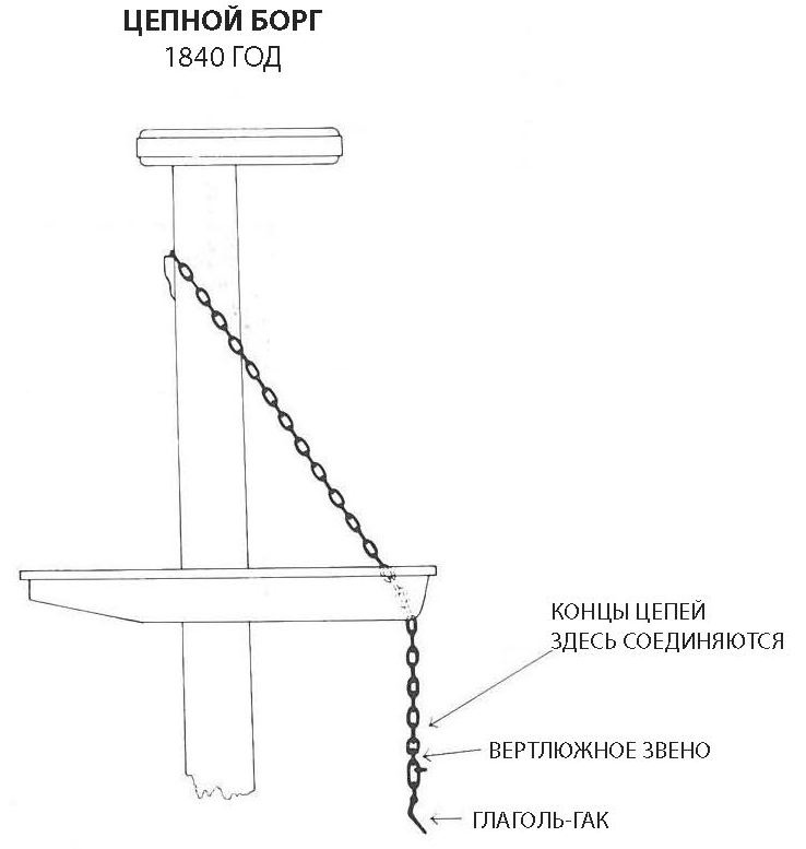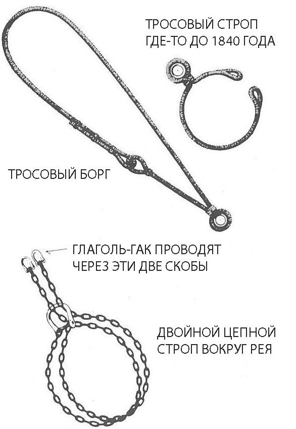Борг вошёл в употребление в последней четверти восемнадцатого века, возможно, в 1773 году. Но учтите, что это лишь предположительная дата. Борги сперва использовались в качестве дополнения к гарделям. В военное время тросовые борги меняли на цепные, которые в конце концов и взяли на себя всю работу по удерживанию нижнего рея. Вне зависимости от того, цепной борг использовался или тросовый, в центре рея пристрапливали коуш, а после где-то 1840 года его стали крепить цепным стропом. Тросовый борг крепят найтовом, а цепной при помощи глаголь-гака. Этот коуш пристрапливали так же, как гардель-блоки, за исключением того, что использовался одинарный строп, а не двойной. Оба очка этого стропа найтовили на передней стороне рея плоским бензелем.
