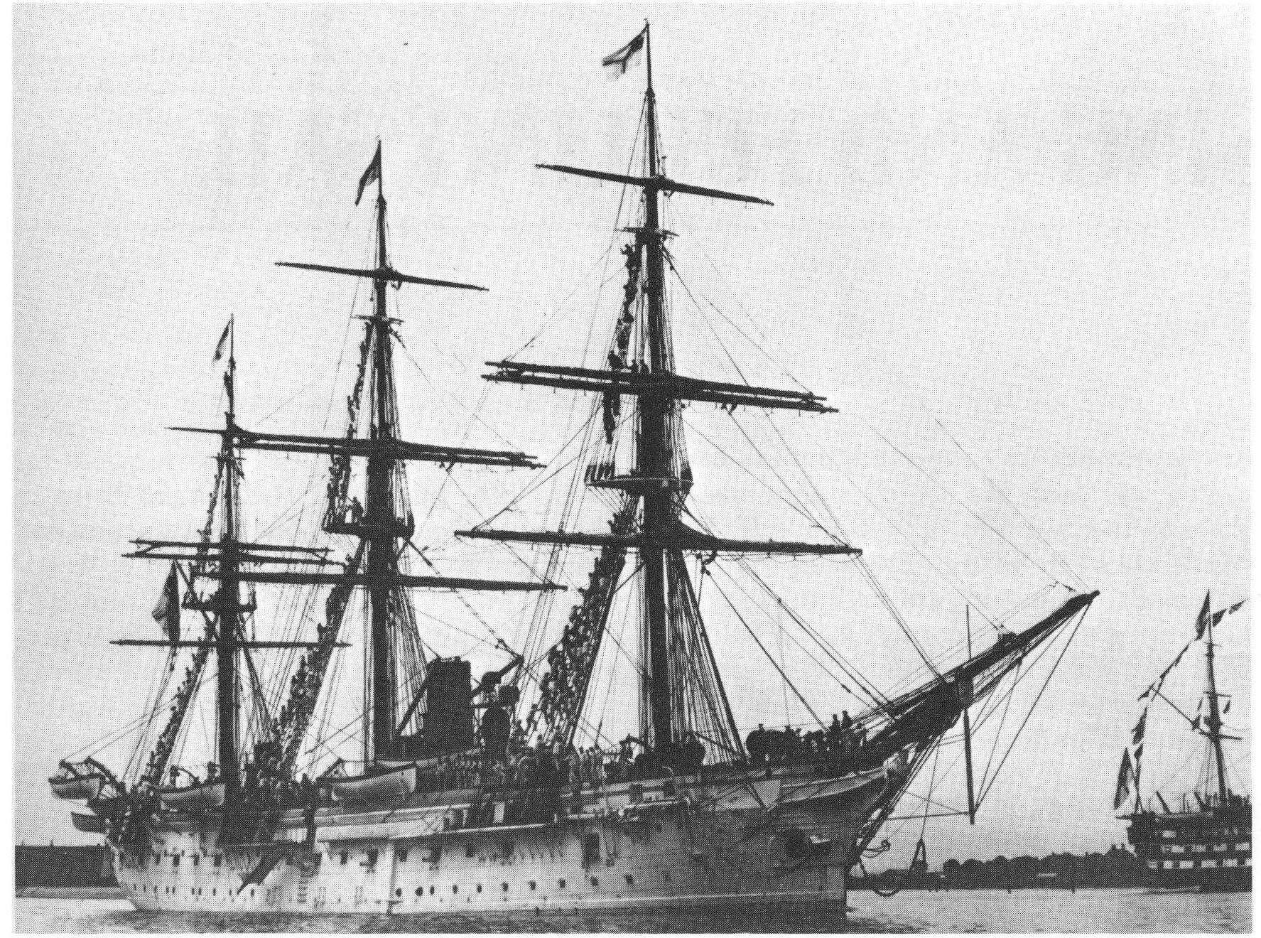 Британский корабль «Edgar», салютующий реями с экипажем на Международном военно-морском фестивале в Портсмуте в 1865 году. Гравюра Лайонела П. Смита в Illustrated London News, 1887 г. (Коллекция Марка Майерса).